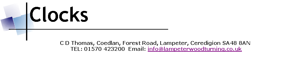 Chris turns a variety of clocks of different sizes and with different faces. The faces are Ceramic with picture / Welsh Slate with or without picture. Sizes will vary from 3.5 to 6 inch in diameter for insert clocks.