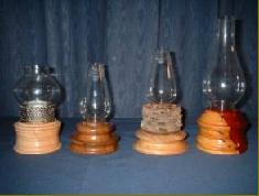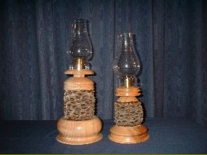 Candle lamps made in a variety of woods. The choice is yours. My favourite, for example is a top and bottom section made from any choice of Hard wood with a middle section made from a nut called a Banksia nut. This grows in Australia. These lamps consist of wooden surround with a brass tube with spring insert which will advance the candle as it burns; the candles burn at a slow rate and all the wax is burnt and ordinary household candles used. (No wax residue left after burning as is the case with ordinary Candle burning). These lamps are fitted with kite marked glass chimneys, which are for oil-burning lamps and so are safe for use with candles.